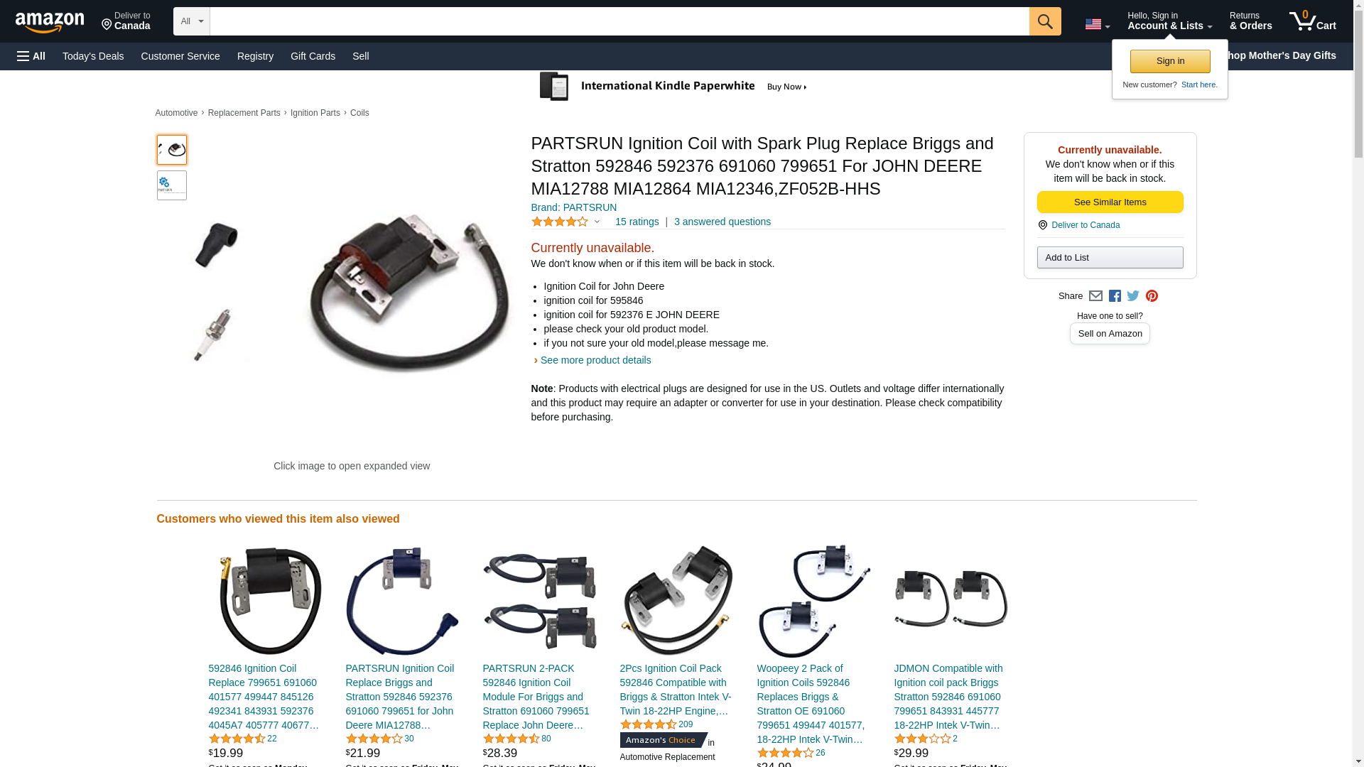 PARTSRUN Ignition Coil with Spark Plug Replace Briggs and Stratton 592846 592376 691060 799651 For JOHN DEERE MIA12788 MIA12864 MIA12346,ZF462B-HHS
