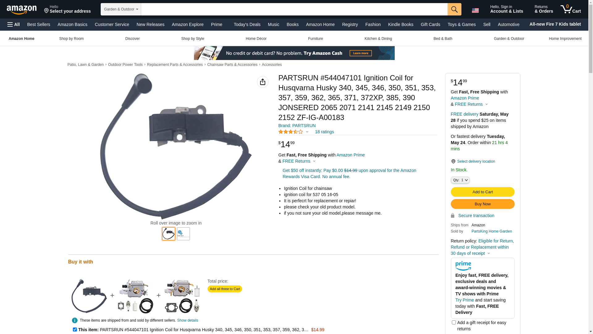 PARTSRUN #544047101 Ignition Coil for Husqvarna Husky 340, 345, 346, 350, 351, 353, 357, 359, 362, 365, 371, 372XP, 385, 390 JONSERED 2065 2071 2141 2145 2149 2150 2152 ZF-IG-A00183