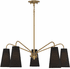 The Savoy House Edgewood 5-light chandelier showcases a relaxed, casually stylish look with tall conical shades of black fabric and a versatile warm brass finish. Perfect for brightening up any space in your home. Edgewood is 32" in diameter and it has an adjustable height ranging from 10" to 64". It uses five candelabra size bulbs with a max of 60 watts per bulb. Comes with four 12" downrods and one 6" downrod, plus 80" of cord.