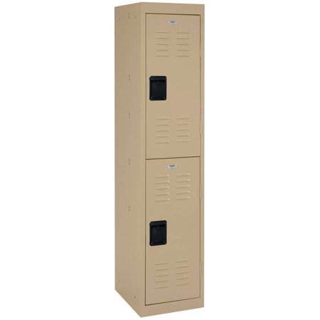 <br /> <b>Sandusky 2-Tier Welded Steel Storage Locker, 66"H, Tropic Sand:</b> <ul> <li>Recessed handle with finger-lift latch</li> <li>Shipped assembled (except for hooks and number plate)</li> <li>Welded steel construction</li> <li>Durable powder-coat finish available in 17 colors</li> <li>Accommodates a standard padlock (not included)</li> <li>Overall dimensions: 15"W x 18"D x 66"H</li> </ul>
