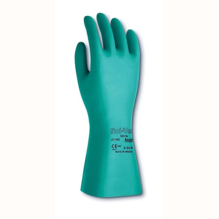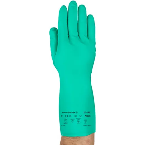 37-145-10 Style: Size Group:10, 11 mil, Len.:13" This item features: -Gloves do not promote contact dermatitis. -High-performance nitrile compound which provides an outstanding combination of strength and chemical resistance. -When exposed to aromatic and petroleum solvents, as well as caustics and animal fats, Sol-Vex gloves have proven to be a superior choice over rubber or neoprene. -Material: Nitrile. -Color: Green. -Usage: Sheet metal assembly, Machining and Degreasing. -Resistance: Chemical, Puncture. -Style: Size Group:10, 11 mil, Len.:13'' - Price is for 12 Pairs. -Style: Size Group:11, 11 mil, Len.:13'' - Price is for 12 Pairs. -Style: Size Group:10, 15 mil, Len.:13'' - Price is for 12 Pairs. -Style: Size Group:11, 15 mil, Len.:13'' - Price is for 12 Pairs. -Style: Size Group:10, 22 mil, Len.:15'' - Price is for 12 Pairs. -Style: Size Group:10, 15 mil, Lining:Flock, Len.:13'' - Price is for 12 Pairs. -Style: Size Group:11, 15 mil, Lining:Flock, Len.:13'' - Price is for 12 Pairs. -Style: Size Group:7, 15 mil, Lining:Flock, Len.:13'' - Price is for 12 Pairs. -Style: Size Group:8, 15 mil, Lining:Flock, Len.:13'' - Price is for 12 Pairs. -Style: Size Group:9, 15 mil, Lining:Flock, Len.:13'' - Price is for 12 Pairs. -Style: Size Group:10, 22 mil, Len.:18'' - Price is for 12 Pairs. -Style: Size Group:11, 22 mil, Len.:18'' - Price is for 12 Pairs. Testing and approvals: -FDA Approval.