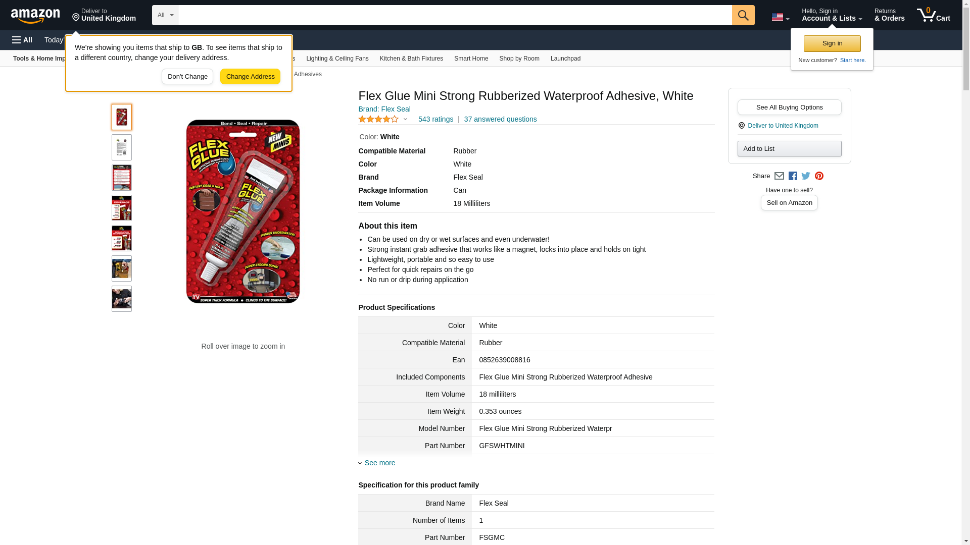 As Seen On TV, .75 OZ, White, Flex Glue, Trial Size, Super Strong Rubberized Waterproof Adhesive That Quickly Bonds To Any Surface Even Wet Or Under Water, Easy To Use, Instantly Bonds, Seals & Repairs Virtually Everything, Instant Grab Holds Objects In Place & In Most Cases Eliminates The Need For Braces, Cures In 24-48 Hours, Reaches Maximum Strength In 7 Days, Mildew & UV Resistant, Paintable, Solvent Free, VOC Compliant, Low Odor & Will Not Shrink Or Crack, Won't Run Or Drip & Can Easily Be Applied To Vertical & Overhead Surfaces, Use On All Types Of Metal, Wood, Foam, Rubber, Tile, Ceramic, Marble, Porcelain, Glass, Granite, Brick, Concrete, Stucco, Plaster, Stone, Masonry, Drywall, Sheetrock, Fiberglass, Some Plastics & Vinyl's, Composites, PVC, EPS, EPDM, Full Size Options Available: TV#'s 239508 & 239509, Not Included.