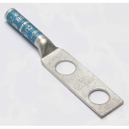 'Two-Hole Lug Compression Connector, Connector Type Straight Barrel, Cable Size 6 AWG, Tongue Style Standard, Color Code Blue, Die Code 7, Length 3.22 In., Barrel Length Long, Material Copper, Plate Material Electro Tin, Stud Size 3/8 In., Hole Center to End 0.410 In., Hole Center to Center 1.000 In., Width 0.59 In., Peep Hole No, Standards UL Listed, CSA Certified, UL467'