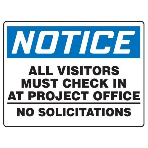 NOTICE ALL VISITORS MUST CHECK IN AT PROJECT OFFICE NO SOLICITATIONS 18" x 24" Plastic Sign