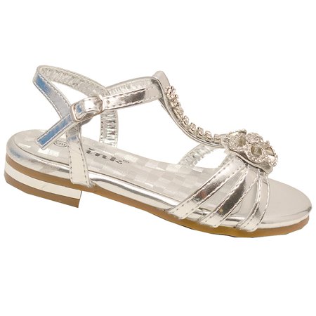 <ul><li>T-bar sandals from Link featuring a glossy shine</li><li>Open toe sandal comes in silver color design</li><li>Rhinestone embellished flower and T-strap</li></ul>