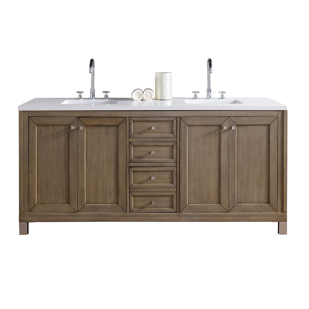 The Chicago 72" Whitewashed Walnut vanity by James Martin Furniture is a wall-mount optional cabinet with mounting brackets and chrome finish legs. This cabinet features tip out drawers for added storage space, soft-close door hinges, and soft-close drawer glides.<br><br>PLEASE NOTE:<br>*Please refer to top sample images for actual top color.<br>*Mirrors are shown for demonstration purposes and may be ordered separately.<br>*Faucets and accessories are not included.<br>*Cabinets are fully assembled. Pulls may be attached to insides of doors and drawers to prevent damage. On some models, countertops and sinks may be boxed separately and require light assembly.<br>*Granite and Marble tops are made from natural stone and exhibit some variation in color tone and veining. Customers who prefer to avoid natural variation may wish to consider Quartz or Solid Surface tops.<br><br>Four full size doors for easy access and Three full-depth drawers (one is double-height) for ample storage.<br>Cabinets are finished inside and out, with a premium undercoat finish for superior moisture and UV resistance.<br>Vanity cabinet may be hung on wall, or chrome finish metal legs may be used for the cabinet to sit on the floor.<br>Cabinet height without legs is 27.6"<br>Cabinets purchased separately will work with your own top<br>Soft-close, undermount drawer glides and soft-close door hinges<br><br>SPECIFICATIONS<br>Collection Name: Chicago<br>Theme: Contemporary/Modern, Transitional<br>Ships Freight or Ground: Freight<br>Construction Material: Acacia Solids with American Walnut<br>Vanity Base Color/Finish: White Washed Walnut<br>Distressed Finish: Yes<br>Vanity Countertop Material: N/A<br>Countrertop ThicknessN/A<br>Hardware Finish: Satin Nickel<br>Vanity Height: 32.75<br>Vanity Width (Without Top): 72<br>Vanity Depth (Without Top): 23.5<br>Assembly Required: No<br>Number of Shelves: 2<br>Number of Doors: 4<br>Soft Close Hinges: Yes<br>Number of Drawers: 3<br>Soft Close Slides: Yes<br>Bac