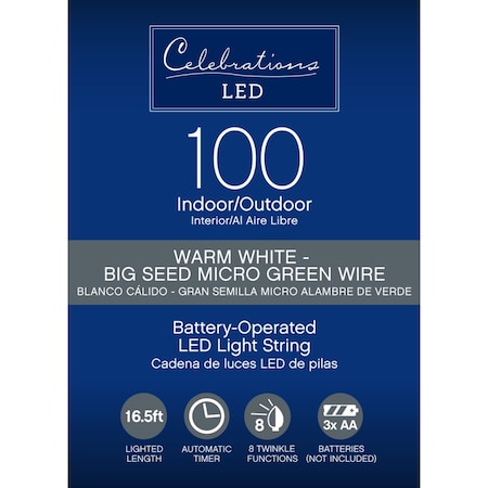 Highlights: Power Type: LED Bulb Color: Clear/Warm White Bulb Count: 100 count Lighted Length: 16.5' Power Source: Battery Operated Certifications and Listings: ETL Listed Wire Color: Green wire Maximum Number of Sets Connected: 0 Batteries not included Battery operated to easily decorate anywhere Perfect for indoor an