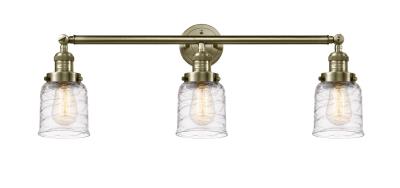 INNOVATIONS 205-AB-G513-LED 3-Light Bath Vanity Light Antique Brass. Collection: Franklin Restoration. Style: Industrial, Farmhouse, Restoration-Vintage, Traditional. Metal Finish: Antique Brass. Metal Finish (Canopy/Backplate): Antique Brass. Material: Steel, Cast Brass, Glass. Dimension(in): 11(H) x 30(W) x 9(Ext). Bulb: (3)6W Medium Base,Dimmable(Not Included). Maximum Wattage Per Socket: 100. Voltage: 120. Color Temperature (Kelvin): 2700. CRI: 82. Lumens: 600. Glass Shade Description: Clear Deco Swirl Small Bell. Glass or Metal Shade Color: Deco Swirl. Shade Material: Glass. Glass Type: Transparent. Shade Shape: Bell. Shade Dimension(in): 5(W) x 5.75(H). Fitter Measurement (Glass Or Metal Shade Fitter Size): 3.25 inch Fitter. Canopy Dimension(in): 4.5(Dia). Backplate Dimension(in): 4.5(Dia) x 0.75(Depth). California Proposition 65 Warning Required: Yes. UL & ETL Certification: Damp Location.