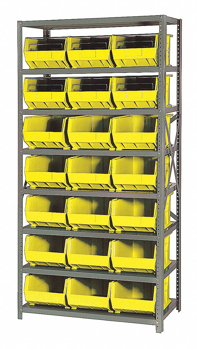 - Bin Shelving: 36 in x 18 in x 75 in, 1 Sided, 21 Bins, Open, Yellow This listing is for each