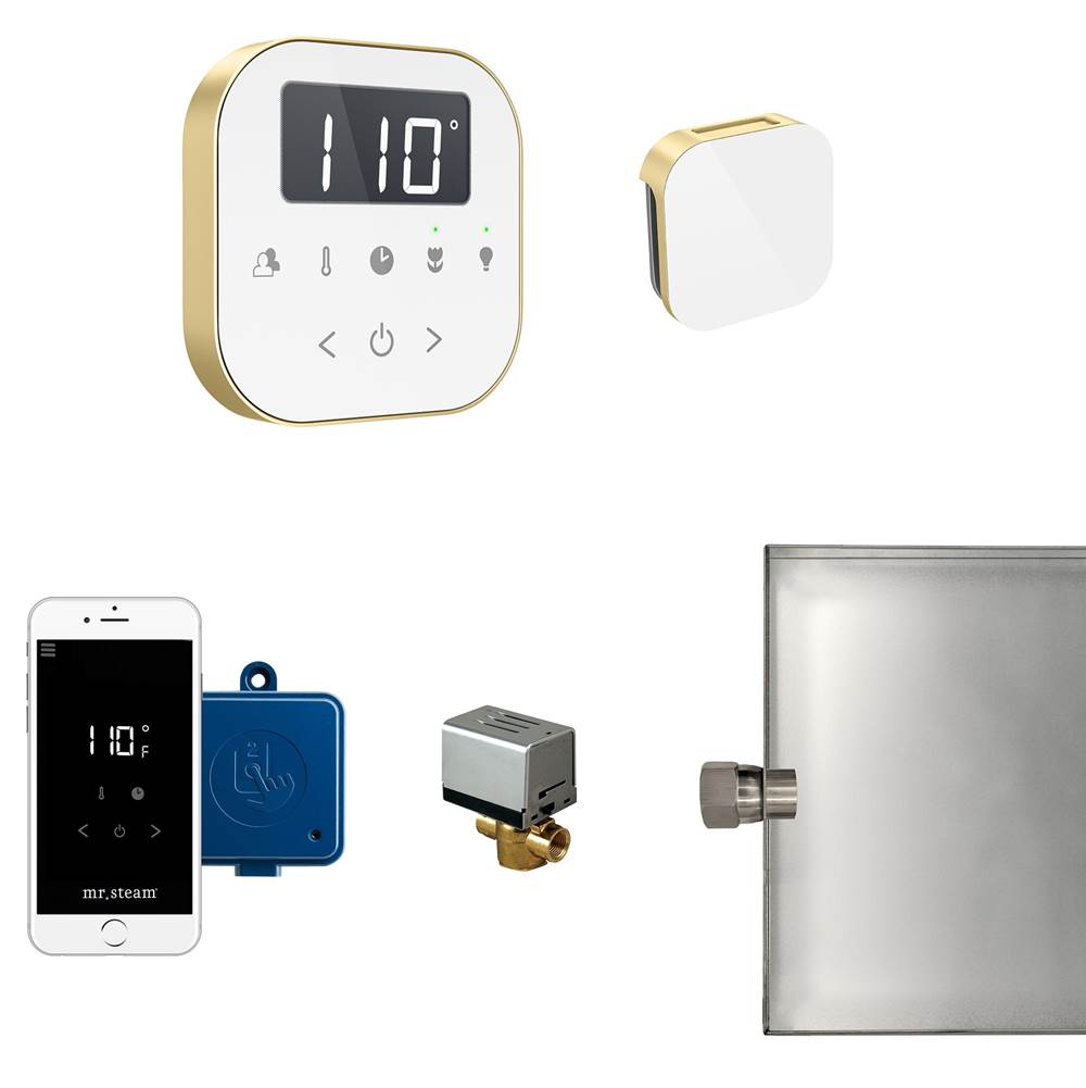 Mr. Steam ABUTLER1W-SB AirButler Steam Shower Control Package with AirTempo Control and Aroma Glass SteamHead in White Satin Brass | AF Supply