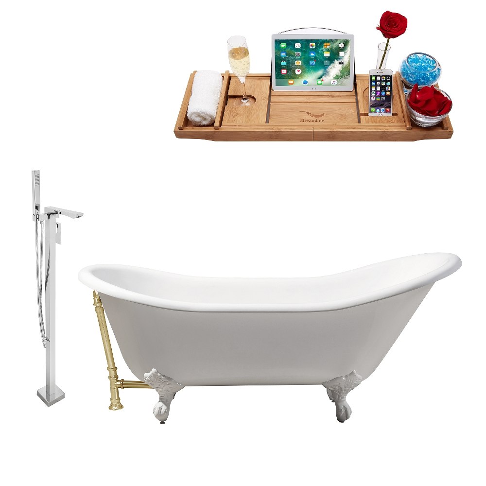 STREAMLINE RH5420WH-GLD-140 67 INCH CAST IRON TUB IN GLOSSY WHITE WITH TRAY AND FAUCET SET IN POLISHED CHROME