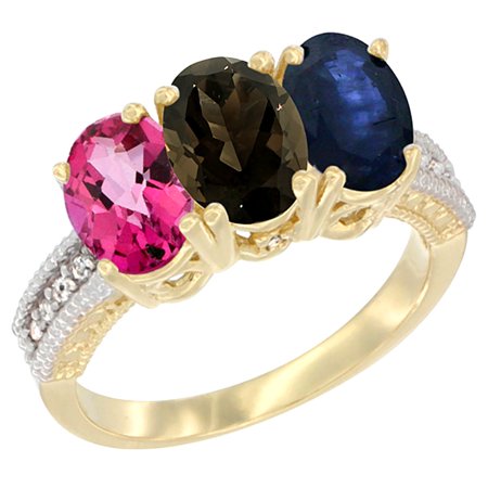 14K Yellow Gold Natural Pink Topaz, Smoky Topaz & Blue Sapphire Ring 3-Stone 7x5 mm Oval Diamond Accent, sizes 5 - 10