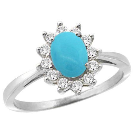 14K White Gold Natural Turquoise Engagement Ring Oval 7x5mm Diamond Halo, sizes 5-10