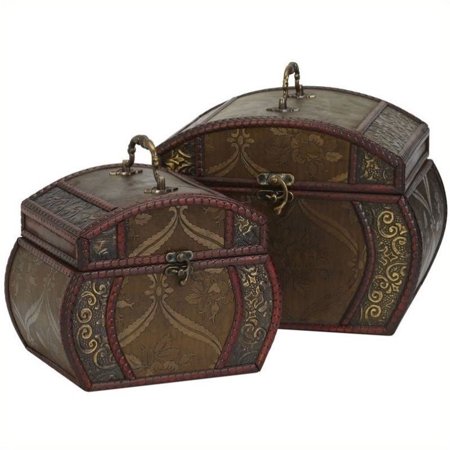Take a moment to admire the intricate design work on both boxes. Notice the curved abstract floral designs on the side set against the dark olive background, while the middle is a detailed floral pattern separated by vivid wine colored segmented trim. And to top it off, they come with an intricately designed handle and a clasp to secure belongings. Have you ever seen something so elegant? Curved abstract floral designsA delicately detailed floral patternAn intricately designed handle and claspSpecifications:Small Size Dimensions: 9" H x 9" W x 6.5" DLarge Size Dimensions: 10" H x 12" W x 8" D