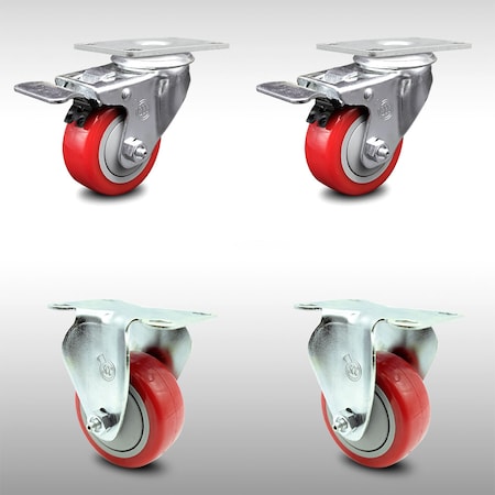 Stainless Steel Polyurethane Top Plate Caster Set of 4 w/3.5" x 1.25" Red Wheels - 2 Swivel Casters w/Total Locking Brake & 2 Rigid - 1200 lbs Capacity/Caster - Service Caster Brand