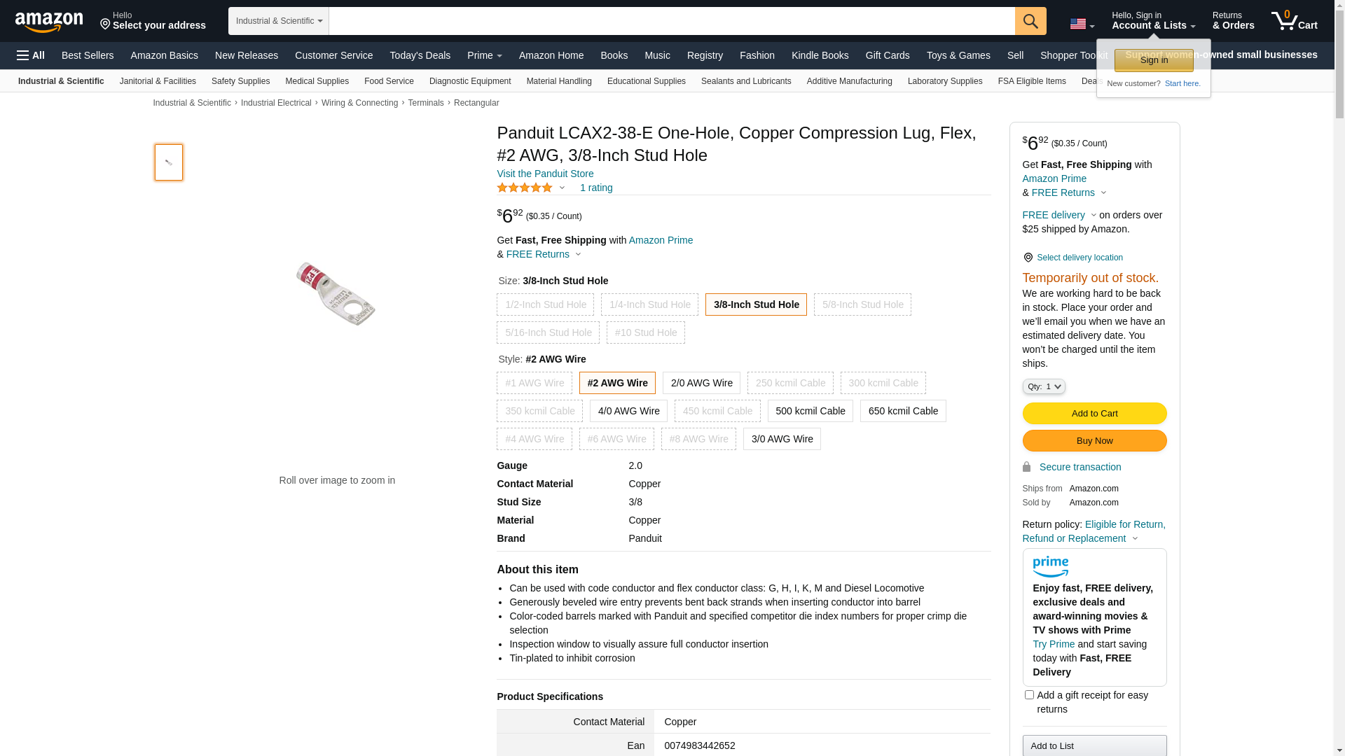 Panduit LCAX8-38-L Copper Compression Lug, 1 Hole, #8 AWG Flex, 3/8-Inch Stud