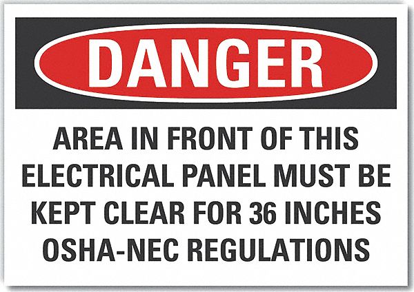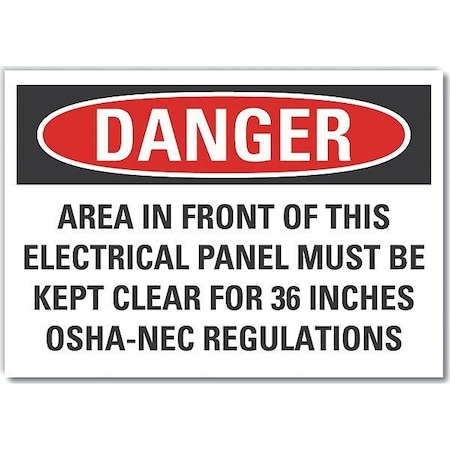Danger Sign, Horizontal Rectangle, Number of Printed Sides 1, English, Sign Format Traditional OSHA, Sign Legend Area In Front Of This Electrical Panel Must Be Kept Clear For 36 Inches Osha-Nec Regulation, Sign Legend Background Color White, Sign Legend Style Text