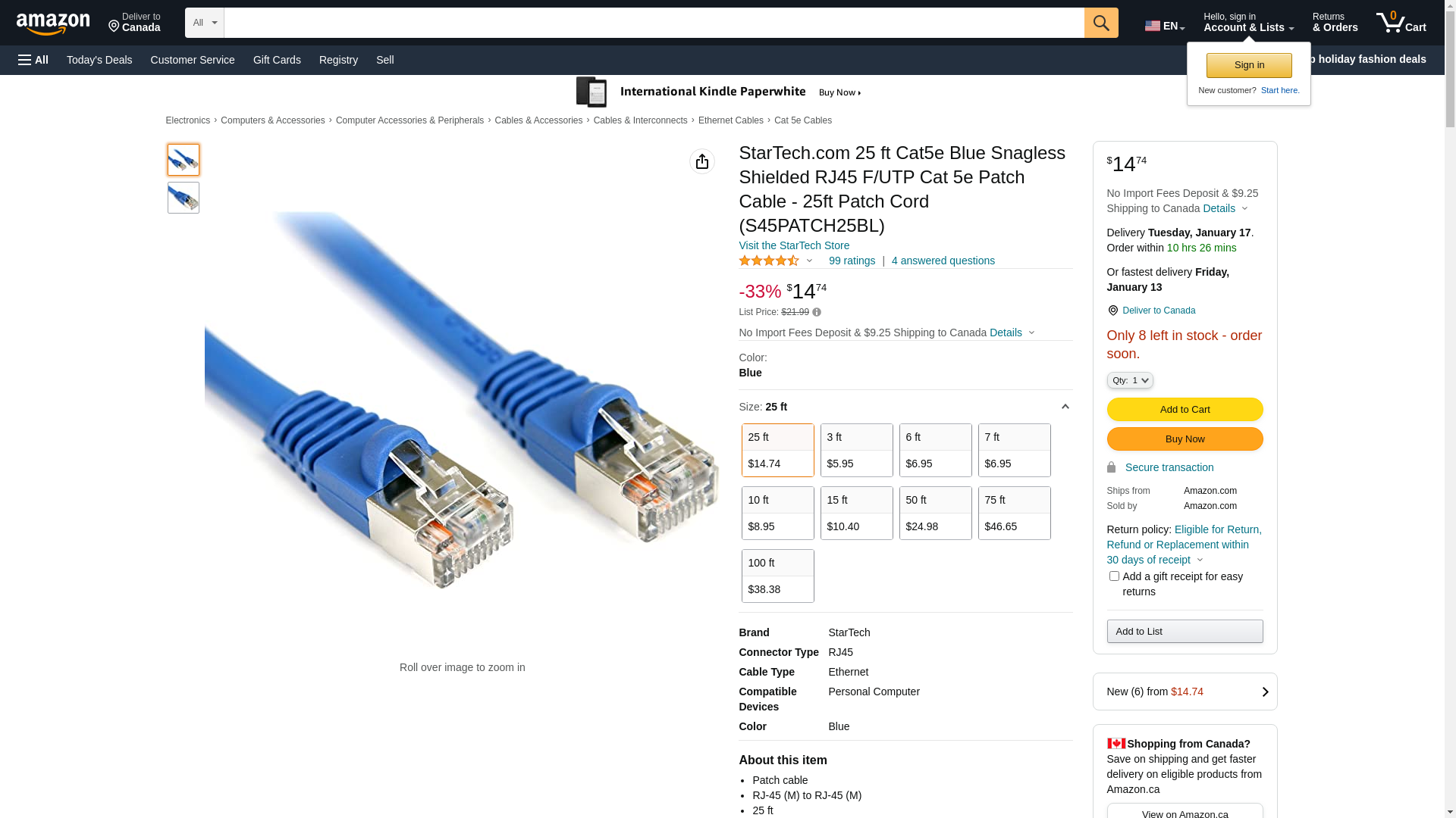 STARTECH.COM 25 FT BLUE SHIELDED SNAGLESS CAT5E PATCH CABLE25 FT BLUE SHIELDED SNAGLESS CAT5E PATCH CABLE Manufacturer : STARTECH.COM UPC : 065030799959