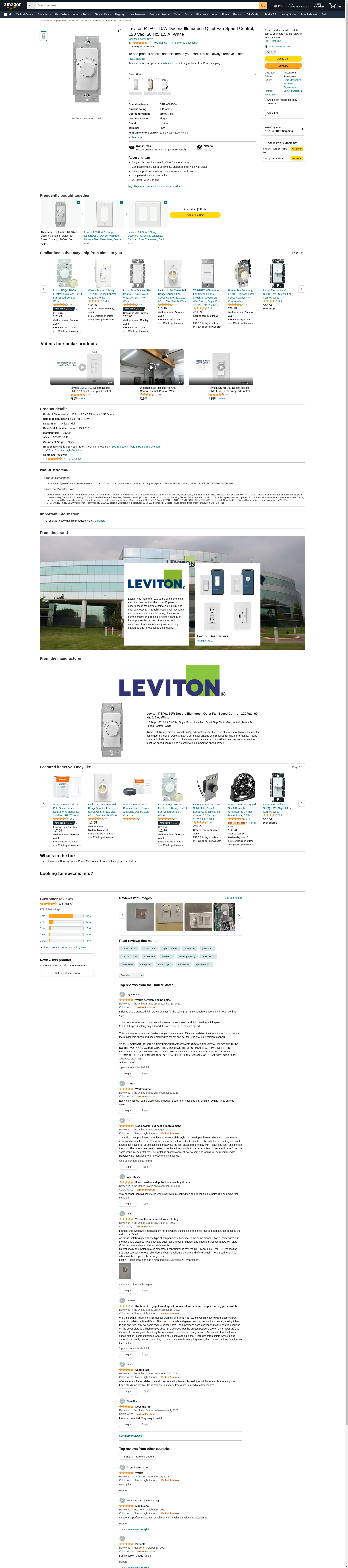 Leviton White Decora Style Rotary Fan Speed Control (RTF01-10W). More details: Amperage: 1.5 amps Poles: Single Pole ...