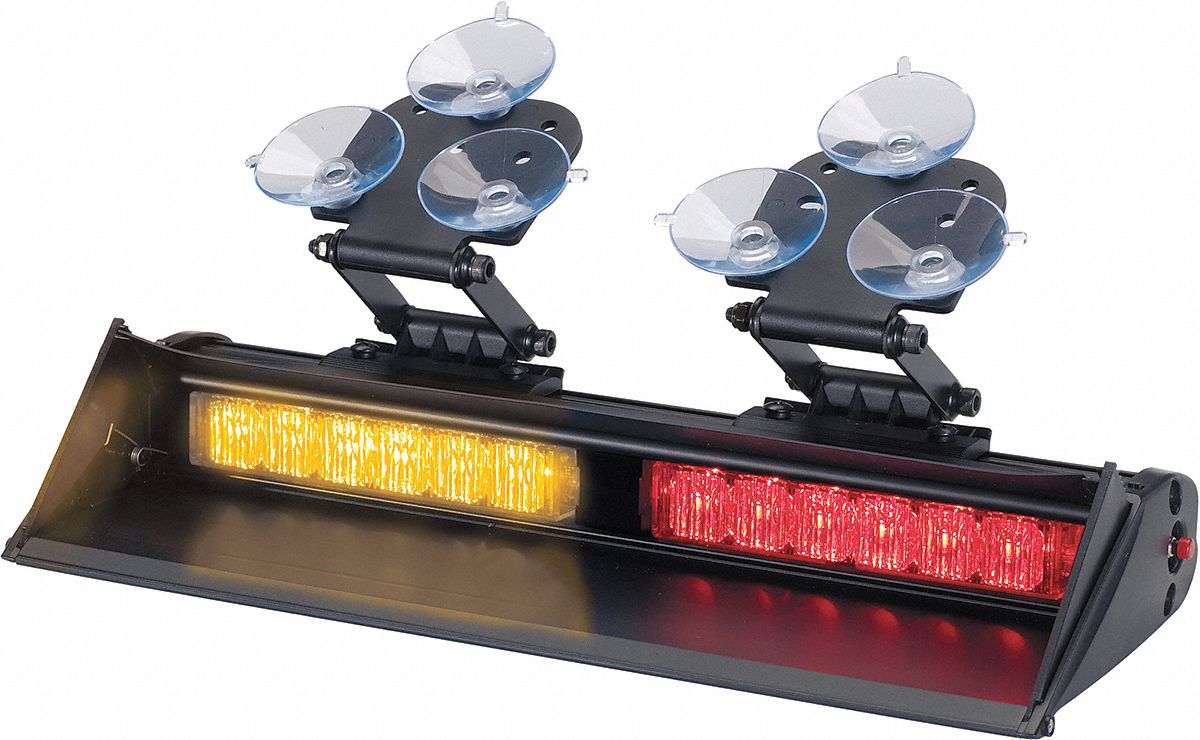 Shrouded Dual Head Dash/Deck Light LED Red/Amber Base Material Aluminum Housing Material Aluminum Housing Color Black Lens Material Polycarbonate Lens Color Clear Mounting Suction Cup 12/24VDC Current Drawn 0.5A Lamp Life 100 000 hr. Width 12-7/8 In. Depth 4-3/4 In. Height 1-3/4 In. 22 Flash Patterns Flashes per Minute Variable Retractable Side Guards and Visor Standards SAE J845 J595 Class I California Title 13 Includes 12 ft Cord w/Lighter Plug and On/Off Switch