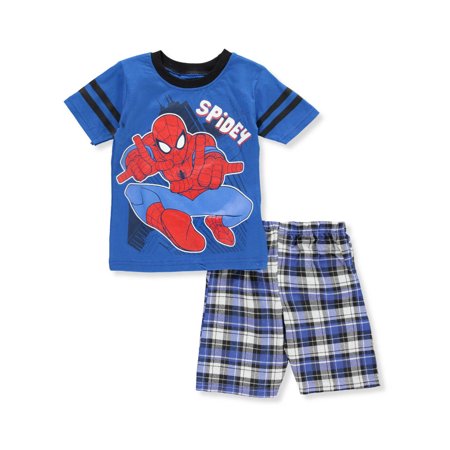 <ul> <li>Spider-Man 2-piece outfit</li> <li>Jersey T-shirt with character graphic, striping at sleeves, and contrast rib-knit neckline (100% cotton; machine wash cold, gentle)</li> <li>Woven plaid shorts with character patch at leg and elastic waistband (55% cotton, 45% polyester; machine wash cold, gentle, inside out)</li> <li>Imported</li> </ul>