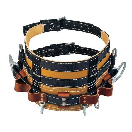 - Honeywell 9'' full-floating belt, leather back saver body pad, 1-3/4'' leather D-saddle, waist strap, and secondary side D-rings for climbing above obstructions (22'' D-size) 88N-1/D22