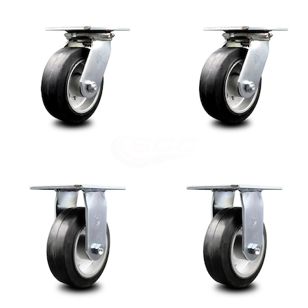 Heavy Duty Large Top Plate Rubber on Aluminum Swivel Caster Set of 4 w/6" x 2" Black Wheels - Includes 2 Swivel & 2 Rigid - 2200 lbs Total Capacity - Service Caster Brand