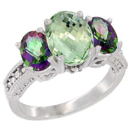 14K White Gold Diamond Natural Green Amethyst Ring 3-Stone Oval 8x6mm with Mystic Topaz, sizes5-10