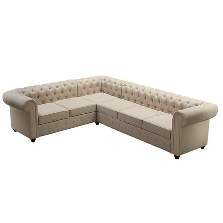 <ul> <li>Seat cushions on this sectional are removable if they need to be washed, but the back cushions are attached</li> <li>Bun feet (removable) made by solid wood with dark espresso finish</li> <li>Noteworthy five enfolding on the arm crown</li> <li>Detachable arms</li> <li>Deep hand-tufting on back and rolled arms</li> </ul>