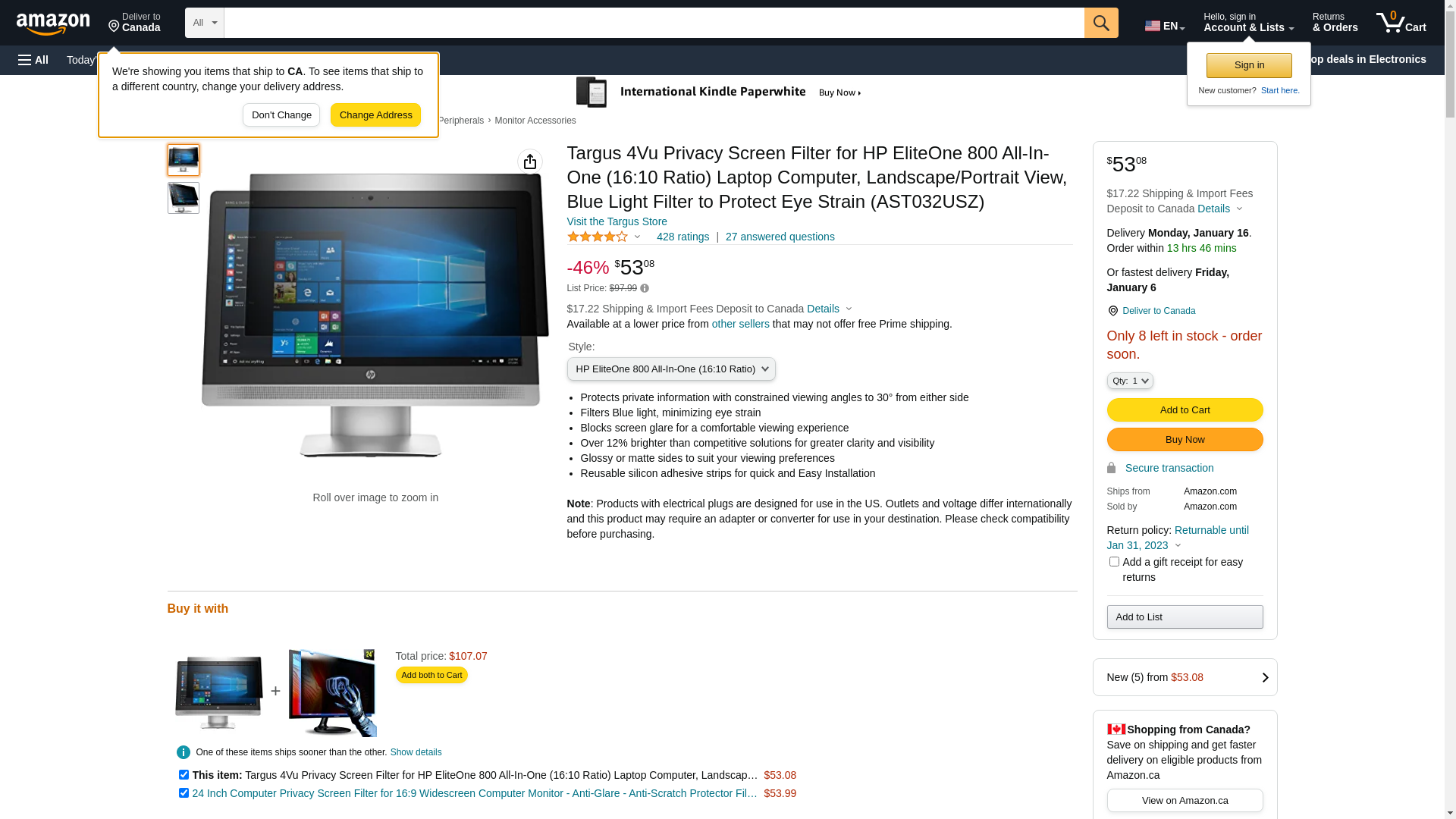 Targus 4Vu Privacy Screen Filter for HP EliteOne 800 All-In-One (16:10 Ratio) Laptop Computer, Landscape/Portrait View, Blue Light Filter to Protect Eye Strain (AST032USZ)