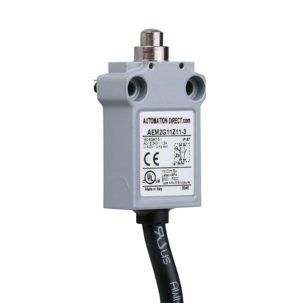 AEM2G11Z11-3 - AutomationDirect compact limit switch, metal plunger, (1) N.O./(1) N.C. contact(s), snap action, 25mm hole spacing, zinc alloy, pigtail,...