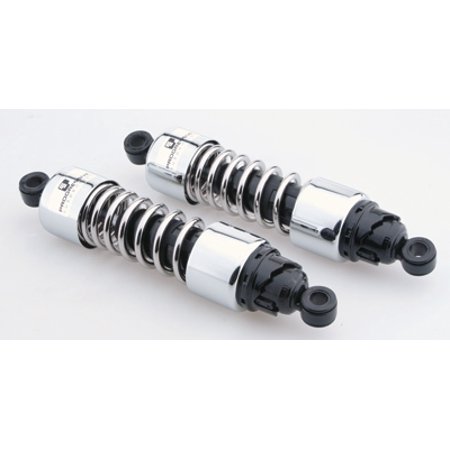 Length: 11 in.<br>Marketing Color: Chrome<br><br>Manufactured from the finest materials available.<br> The 412s simple, durable design makes them a cost effective improvement to your motorcycles suspension performance.<br> A five position cam style spring load preload adjuster lets you easily dial in your ride.<br> Available with either a standard or heavy duty progressive spring rates.<br> Sold in pairs.<br> Made in the USA.<br> Many fitments are available in either Standard or Heavy Duty. HD applications are recommended for bikes that are operated at or near the manufacturers maximum load rating over 50% of the time..<br> Before purchasing or attempting to install shocks that are different than the OEM length, confirm that your wheel travel can be altered without causing clearance issues such as swingarm/axle to exhaust contact as well as chain/belt guard or tire contact..