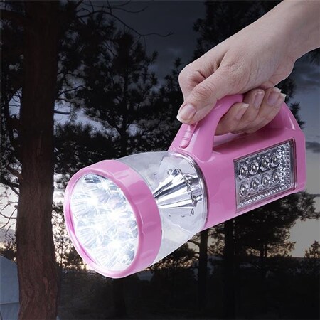 - PRODUCT DETAILS - Materials: Plastic and Metal. Dimensions: (L) 3.25" x (W) 4" x (H) 8". Has 8 LED Bulbs in Each Light Section. Works as Lantern, Flashlight, and Panel Light. Requires 3AA Batteries (not included). Color: Pink.
