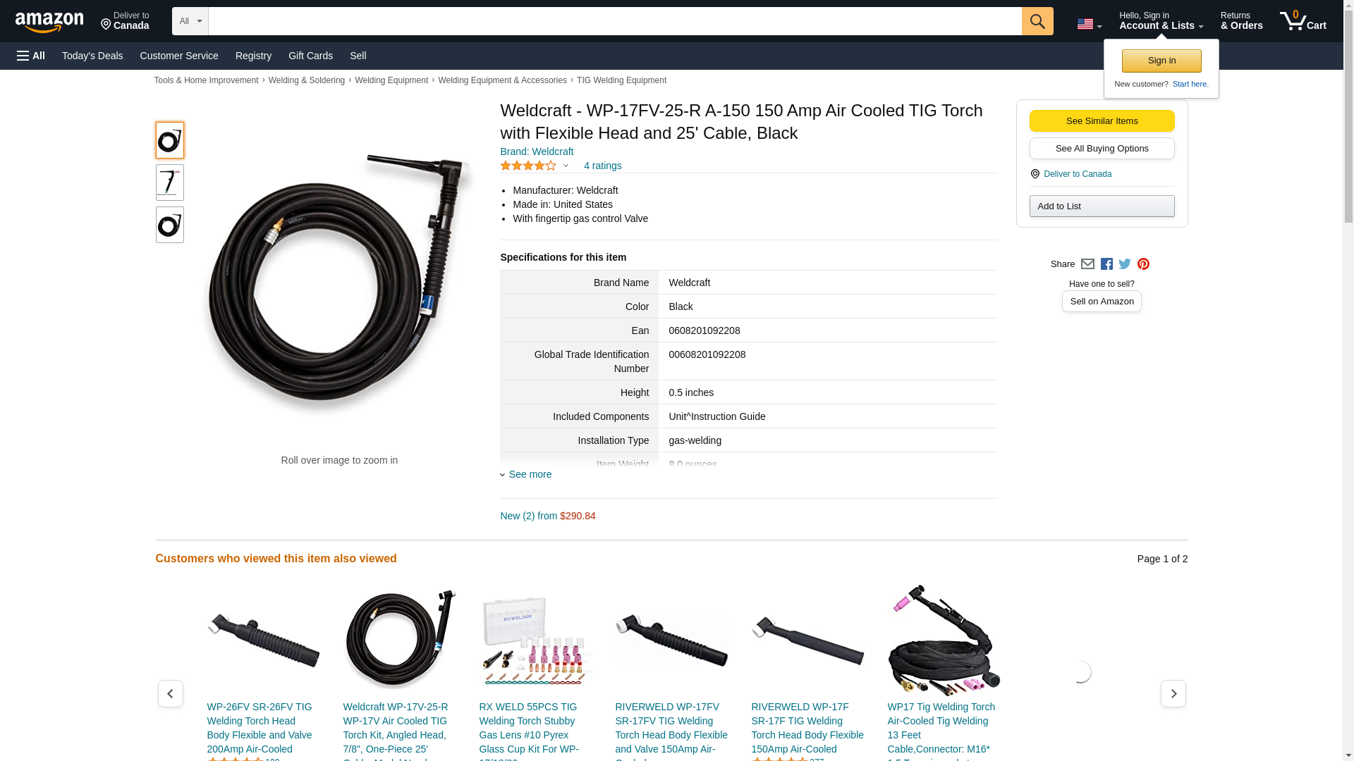 Weldcraft - WP-17FV-25-R A-150 150 Amp Air Cooled TIG Torch with Flexible Head and 25' Cable, Black