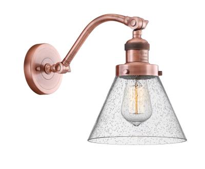 INNOVATIONS LIGHTING 515-1W-AC-G44-LED Large Cone 1 Light Sconce. The Large Cone 1 Light Sconce is part of the Franklin Restoration Collection. Solid Brass 180 Degree Adjustable Swivels with internal teeth that lock in at 5 degree intervals. Collection: Franklin Restoration. Material: Steel, Cast Brass, Glass. Metal Finish(Body): Antique Copper. Metal Finish (Canopy/Backplate): Antique Copper. Dimension(in): 11.5(H) x 8(W) x 10(Ext). Maximum Wattage Per Socket: 100. Bulb: (1)3.5 Watt LED Vintage Medium Base Bulb Included. Dimmable: Yes. Color Temperature(Kelvin): 2700. Lumens: 350. Color Rendering Index(CRI): 82. Voltage: 120. Glass Shade Description: Seedy Large Cone. Glass Type: Seeded. Glass or Metal Shade Shape: Cone. Glass or Metal Shade Color: Seedy. Shade Material: Glass. Shade Size (Diameter x Height)(in): 7.75 X 6. Shade Fitter Measurement(in): 3.25 inch Fitter. Canopy Dimensions(in): 4.5. Backplate Dimensions(in): 4.5x0.75. Certification: UL & ETL, Damp Location. Solid Brass 180 Degree Adjustable Swivels.