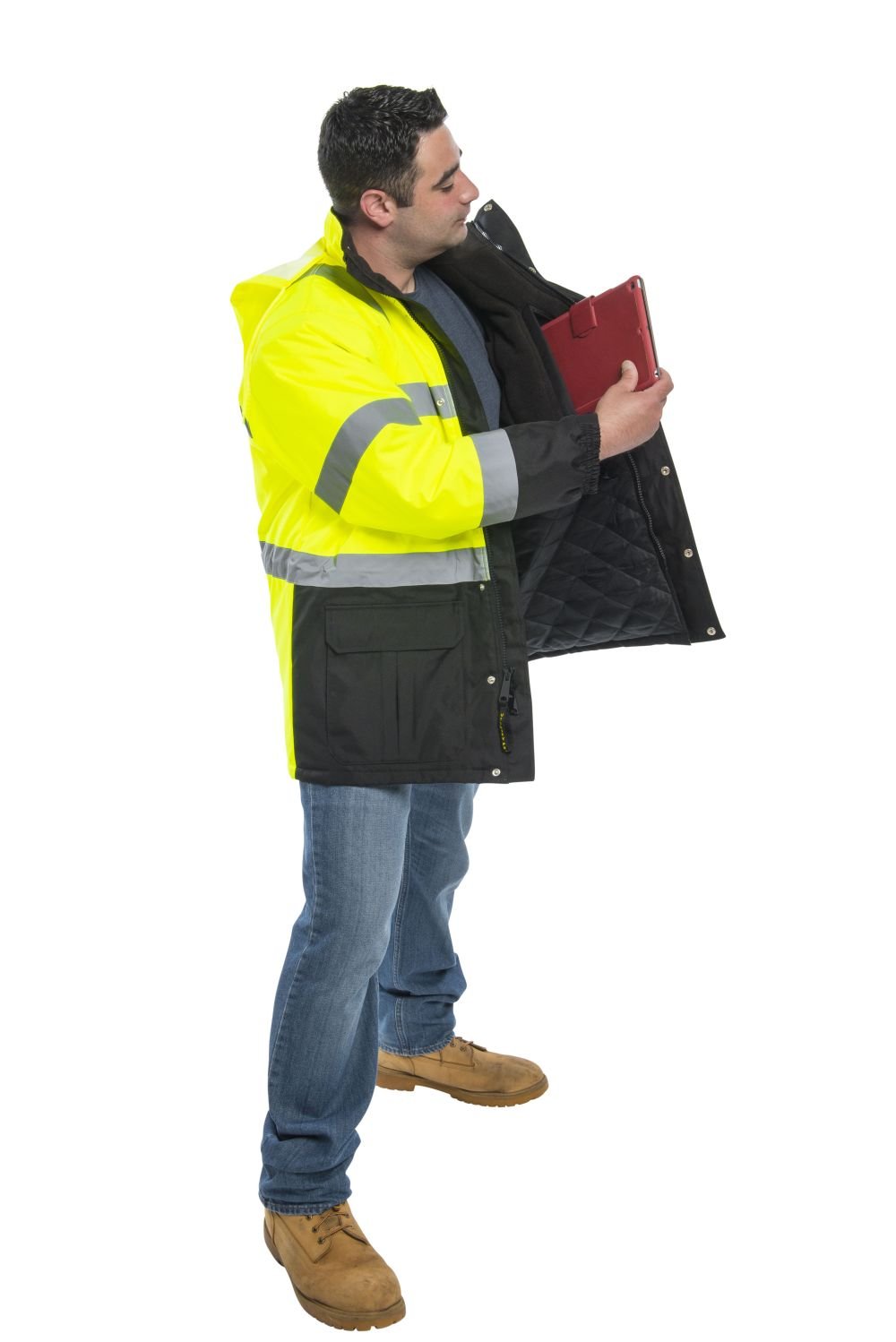 - ANSI Class 3 mens high visibility parka, nylon fabric infused with DuPont Teflon fabric protector, storm fleece and nylon quilted lining