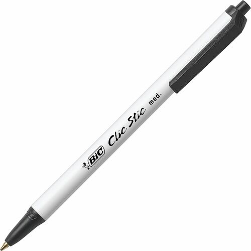 BIC® Clic Stic® Retractable Pens, Medium Point, 1.0 mm, White Barrel, Black Ink, Pack Of 12