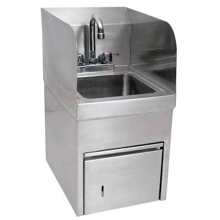 <b>Product Overview:</b><br><br> BK Resources Stainless Steel Deck Mount Space Saver Hand Sink 9"L(Left to Right) x 9"W(Front to Back) x 5" Deep with Tower Dispenser & Faucet<br><br> <b>Product Specs:</b><br><br> - 304 stainless steel deck mount hand sink.<br> - 9" left to right x 9" front-to-back x 5" deep bowl .<br> - Integrated towel dispense & faucet.<br> - 4" deck mount faucet holes.<br> - Wall bracket included.<br> - BKDR-2 basket drain included.<br> - NSF Approved.<br> - See diagram for detail size.<br>