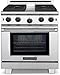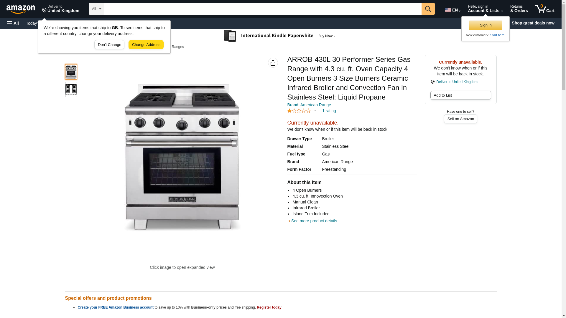 American Range Stainless Steel Freestanding Gas Range ARROB430L. True commercial lift-off burners for easy cleaning. 3 sizes of burners to serve your everyday needs: 25,000 BTU (lg), 18,000 BTU (med) and 12,000 BTU (sm). Variable infinite flame settings for all open top burners. Fail-safe system ensures re-ignition in the event the flame goes out. Continuous and flush commercial-grade cast iron grates. Porcelainized burner pans catch spills and lift out for easy cleaning. Analog controls provide easy, push and turn operation ensuring child safety. Blue LED light indicates oven functions. Heavy duty metal die-cast black satin knobs with chrome bezels. Stainless Steel Island Back Trim included and installed. Front panel switch controls oven lighting for optimal visibility. One piece durable precision frame construction oven front. Multiple functions include: Standard Bake, Innovection Convection Bake, Infrared Broil and Fan mode. Innovection System with convection fan optimizes uniform air flow. Two chrome plated heavy duty racks with 5 (including base) positions on heavy chrome side supports. Accommodates full size commercial sheet pan. Ceramic Infrared Broiler provides rapid searing at 1,800*F. Quick Preheat times and uniform cooking temperature with 28,000 BTU Bake Burner. Extra-large viewing window in oven door. Porcelainized oven interior simplifies cleaning. Overall Oven Capacity: 4.3 Cu. Ft. Surface Burner Rating - Large: 25,000 BTU. Surface Burner Rating - Medium: 18,000 BTU. Surface Burner Rating - Small: 12,000 BTU. Infrared Broiler: 17,000 BTU. Oven Bake Burner: 28,000 BTU. Total Gas Connection Rating: 125,000 BTU 4 Burners. Gas Supply: 7 W.C. Natural, 11 W.C. Propane. Electrical Supply: 120 VAC 15 Amp 60 Hz Single Phase. Shipping Weight: 335 Lbs. Oven Interior Width: 26. Oven Interior Depth: 19. Oven Interior Height: 15. Overall Width: 29 7/8. Overall Depth: 30 1/2. Overall Height: 37. American Range Inspired by their passion for perfection, renowned for t