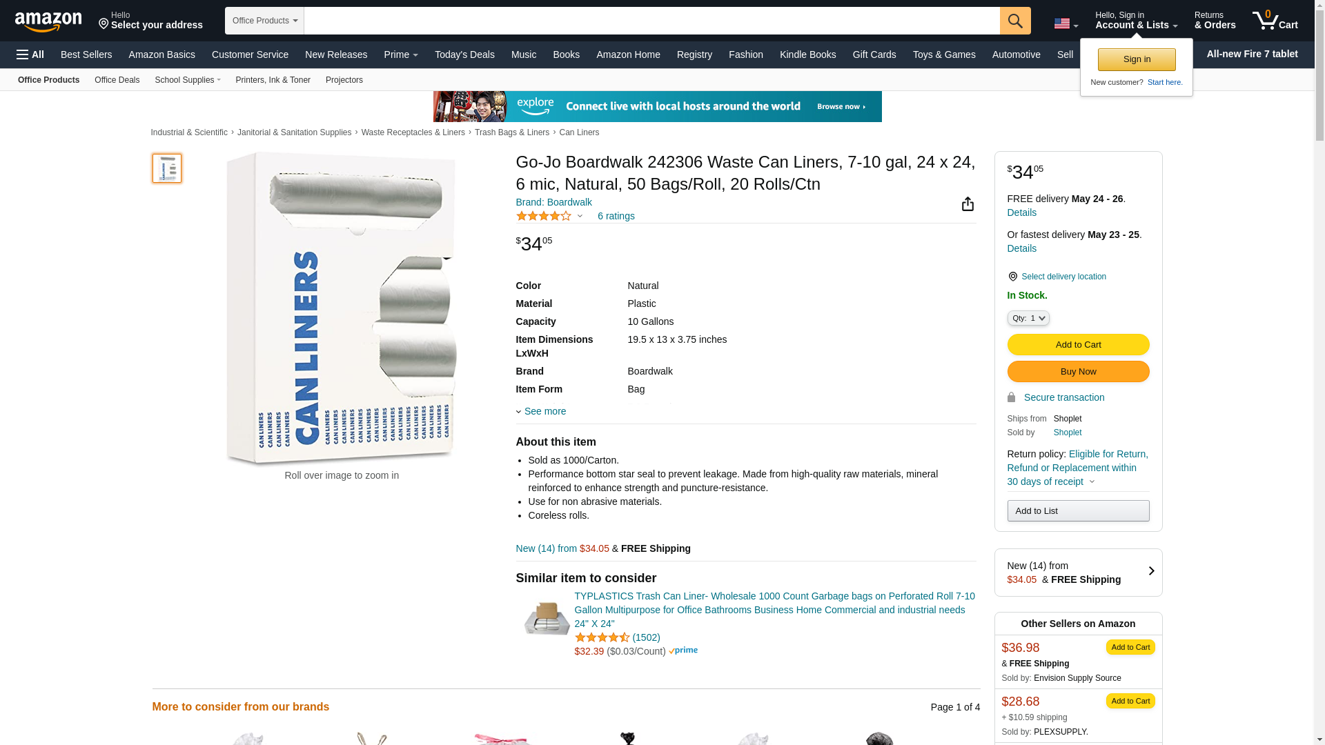 Boardwalk BWK242306 WASTE CAN LINERS, 7-10 GAL, 24 X 24, 6 MIC, NATURAL, 50 BAGS/ROLL, 20 ROLLS/CTN1 CT