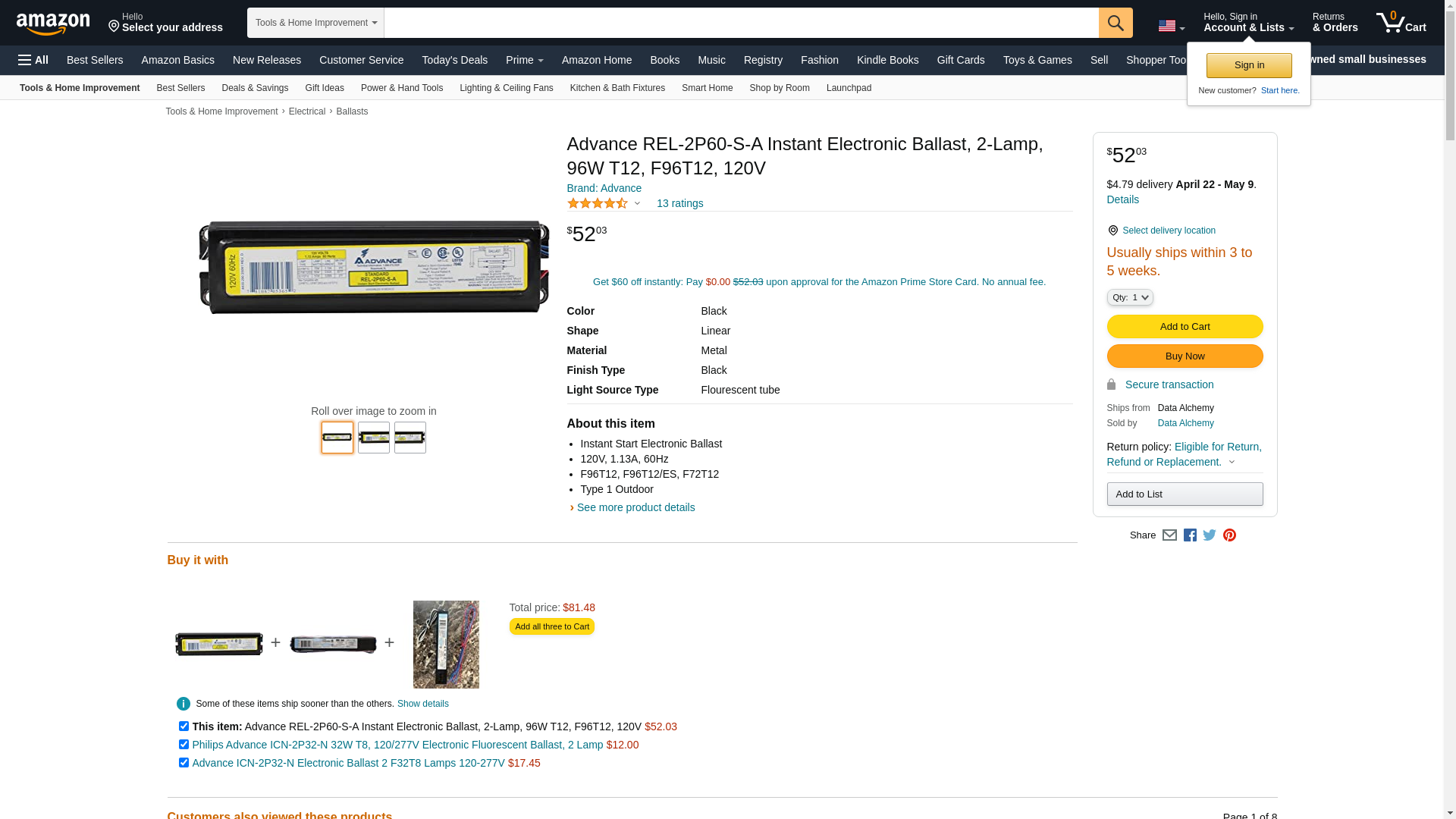 | Feature | Used With Two F60T12, F72T12, F72T12ES, F48T12, F96T12 Or F96T12ES Bulbs - Instant Start |