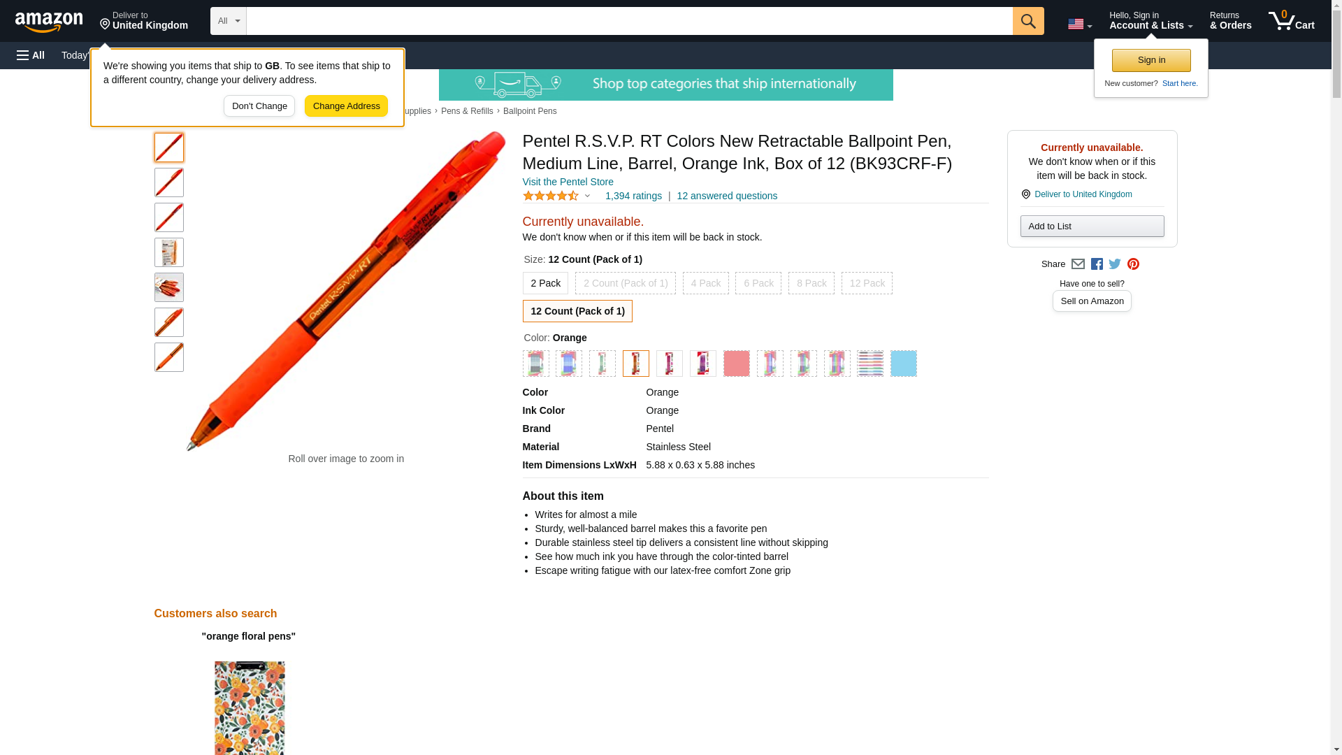 Pentel R.S.V.P. RT Colors New Retractable Ballpoint Pen, Medium Line, Orange Barrel, Orange Ink, Box of 12 (BK93CRF-F...