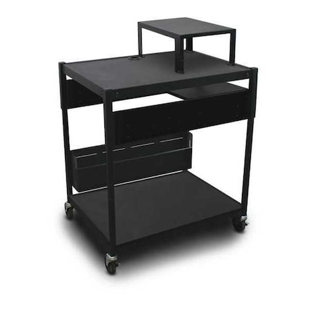 MVBAES2432-01 Features: -Vizion collection. -Full extension ball bearing slides. -Made in the USA. Product Type: -AV Carts. Commercial Use: -Yes. Country of Manufacture: -United States. Primary Material: -Metal. Shelves Included: -Yes. Casters Included: -Yes. Finish: -Black. Pull-Out Shelf: -Yes. Number of Shelves: -2. Dimensions: Overall Width - Side to Side: -32". Overall Depth - Front to Back: -24". Overall Product Weight: -80 lbs. Height Adjustable: -Yes. Overall Height - Top to Bottom: -46". Minimum Overall Height - Floor to Tabletop: -31". Maximum Overall Height - Floor to Tabletop: -39".