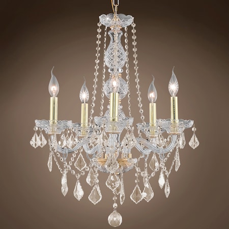 Joshua Marshal Elizabeth 5 Light 21" Gold Chandelier With Cognac Crystals 701438-003 From Elizabeth Collection<br>Welcome To The Elizabeth Collection Where Details Are A Must & Traditional Elegance Is Key. This Beautiful Glass-Arm Collection Is Patterned After Classic Designs From The Victorian Era. This Gorgeous Chandelier Features Gracefully Contoured Glass Arms & A Detailed-Rich Glass Center Column And Bobeches. Providing Brilliant Light Effects And Tons Of Sparkle This Delicately Beautiful Crystal Chandelier Collection Is Perfect For That Dramatic And Romantic Touch To Your Decor. This Particular Light Fixture Comes With Cognac European Crystals And No Bulbs.