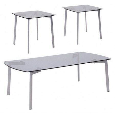 <p>This contemporary table set includes a rectangular shaped coffee table and square shaped side table. The smoke colored glass adds a beautiful touch that will look great in the living room. Adjustable floor glides will keep the unit level on uneven floors.<br/><b>Features:</b><br/><ul><li>Finish: Smoke / Silver<li>Material: Glass, Metal, Steel<li>Set includes 1 coffee table, 2 end tables<li>Adjustable floor glides</ul><br/><b>Specifications:</b><br/><ul><li>Coffee Table Dimensions: 15.5'' H x 47.25'' W x 23.75'' D<li>Overall Product Weight: 84 lbs<li>Glass Thickness: 8mm<li>End Table Dimensions: 21.75" H x 21.25" W x 21.25" D</ul></p>