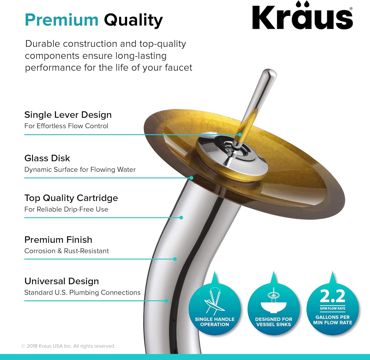 - BATHROOM SET INCLUDES: Vessel sink, waterfall faucet with matching glass disk, pop-up drain