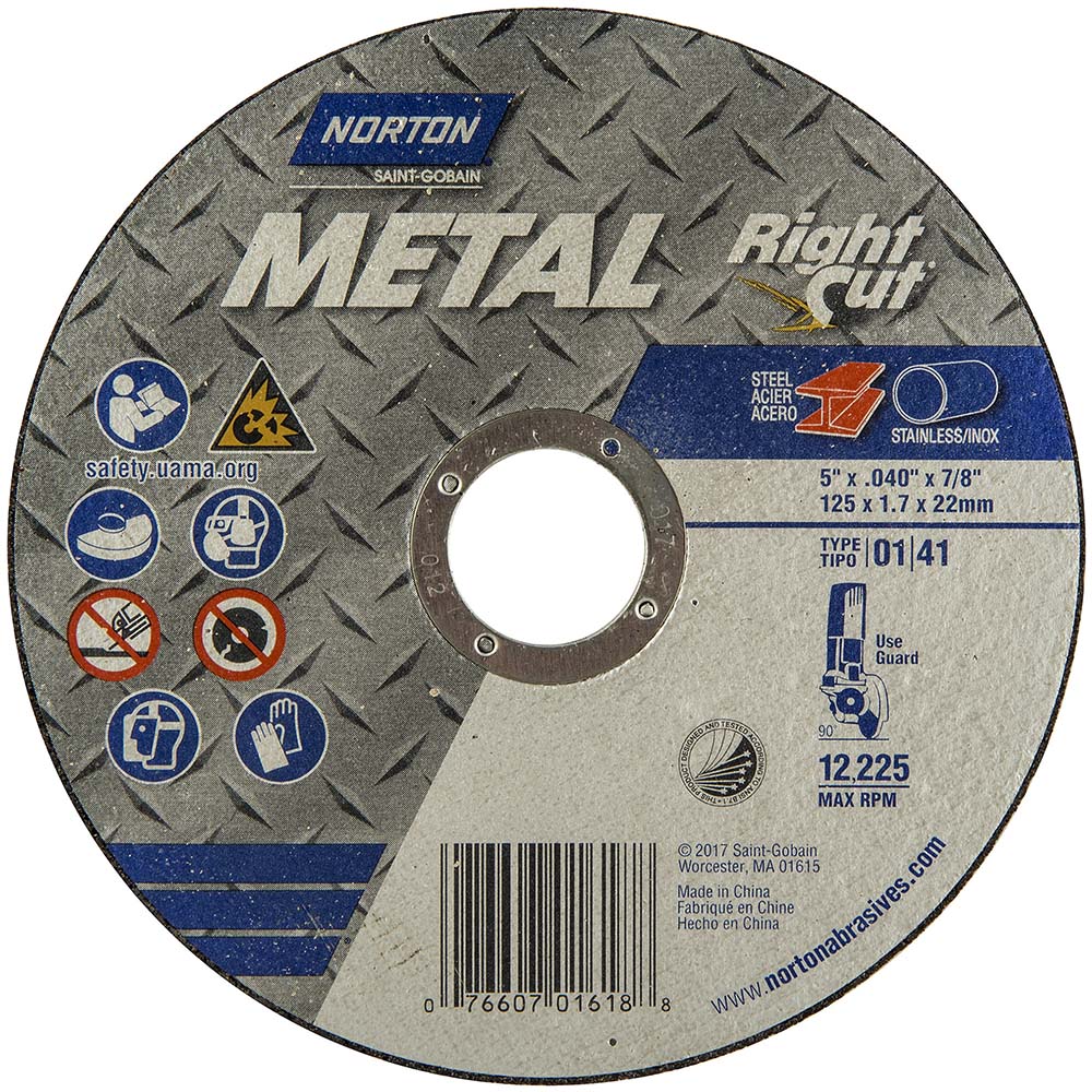 - Price For: Each Diameter: 5" Wheel Type: 1 Item: Cut-Off Wheel Material: Aluminum Oxide Application: Ferrous Metal, Gray Iron, Stainless Type: 1 Max. RPM: 12, 225 Diamond Knockout: No Grit: 60 Arbor Hole: 7/8" Wheel Specifications: Norton Metal Rightcut Thickness: 0.040" Series: Norton Metal RightCut