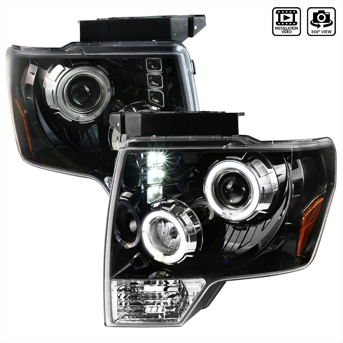 Spec-D Tuning Halo + LED [Jet Black] Projector Headlights Compatible with 2009-2014 Ford F150, Left + Right Pair Headlamps Assembly
