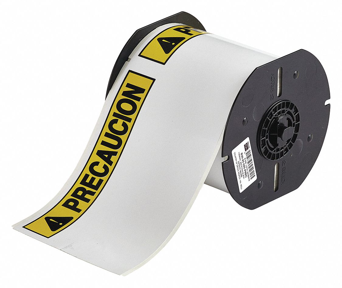 - Label pre-printed with Spanish Precaucion header and blank area beneath for printer to print text
