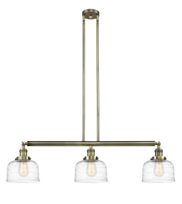 INNOVATIONS 213-AB-G713 3-Light Island Light Antique Brass. Collection: Franklin Restoration. Style: Industrial, Farmhouse, Restoration-Vintage, Traditional. Metal Finish: Antique Brass. Metal Finish (Canopy/Backplate): Antique Brass. Material: Steel, Cast Brass, Glass. Dimension(in): 13(H) x 40.5(W) x 8(Ext). Min/Max Height (Fixture Height with Cord or Included Stems & Canopy)(in): 20/44. Wire/Cord: 10 Feet Of Wire. Bulb: (3)60W Medium Base,Dimmable(Not Included). Maximum Wattage Per Socket: 100. Voltage: 120. Color Temperature (Kelvin): 2200. CRI: 99.9. Lumens: 220. Glass Shade Description: Clear Deco Swirl Large Bell. Glass or Metal Shade Color: Clear Deco Swirl. Shade Material: Glass. Glass Type: Transparent. Shade Shape: Bell. Shade Dimension(in): 8(W) x 5.75(H). Fitter Measurement (Glass Or Metal Shade Fitter Size): 3.25 inch Fitter. Canopy Dimension(in): 4.5(Dia) x 0.75(H). Sloped Ceiling Compatible: Yes. California Proposition 65 Warning Required: Yes. UL & ETL Certification: Damp Location.